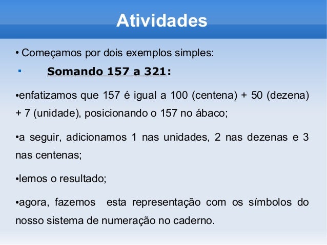 7. 7. Atividades ● Começamos por dois exemplos simples:  Somando 157 a 321: ●enfatizamos que 157 é igual a 100 (centena) + 50 (dezena) + 7 (unidade), posicionando o 157 no ábaco; ●a seguir, adicionamos 1 nas unidades, 2 nas dezenas e 3 nas centenas; ●lemos o resultado; ●agora, fazemos esta representação com os símbolos do nosso sistema de numeração no caderno.
