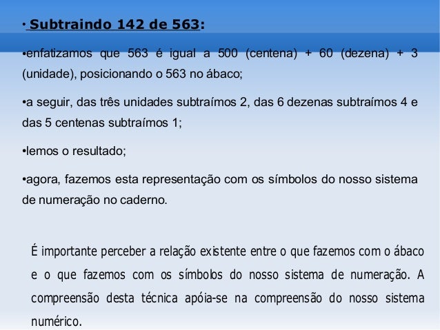 8. 8. ● Subtraindo 142 de 563: ●enfatizamos que 563 é igual a 500 (centena) + 60 (dezena) + 3 (unidade), posicionando o 563 no ábaco; ●a seguir, das três unidades subtraímos 2, das 6 dezenas subtraímos 4 e das 5 centenas subtraímos 1; ●lemos o resultado; ●agora, fazemos esta representação com os símbolos do nosso sistema de numeração no caderno. É importante perceber a relação existente entre o que fazemos com o ábaco e o que fazemos com os símbolos do nosso sistema de numeração. A compreensão desta técnica apóia-se na compreensão do nosso sistema numérico.