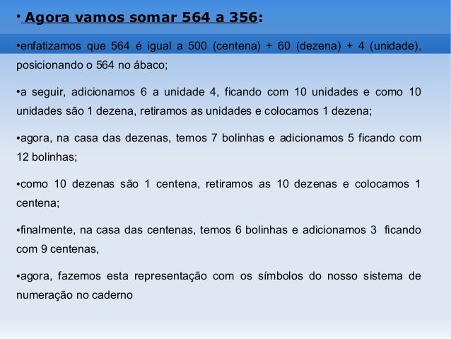9. 9. ● Agora vamos somar 564 a 356: ●enfatizamos que 564 é igual a 500 (centena) + 60 (dezena) + 4 (unidade), posicionando o 564 no ábaco; ●a seguir, adicionamos 6 a unidade 4, ficando com 10 unidades e como 10 unidades são 1 dezena, retiramos as unidades e colocamos 1 dezena; ●agora, na casa das dezenas, temos 7 bolinhas e adicionamos 5 ficando com 12 bolinhas; ●como 10 dezenas são 1 centena, retiramos as 10 dezenas e colocamos 1 centena; ●finalmente, na casa das centenas, temos 6 bolinhas e adicionamos 3 ficando com 9 centenas, ●agora, fazemos esta representação com os símbolos do nosso sistema de numeração no caderno