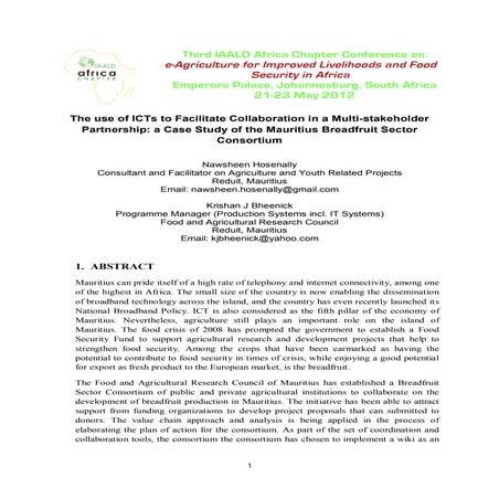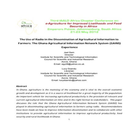 5. 5. CASE STUDY: Presented at the 6th Africa Agriculture Science Week, 15th – 20th July, 2013 - Accra, Ghana resources to be very helpful. They benefit more than those who only rely on limited capacity ICT tools such as mobile phones. The level of understanding of the agricultural information and knowledge they acquire and as a result its application differs. In the midst of this privilege, many farmers even after having access to these shared access ICT centres, still finds the centres to be underutilised, as they lack adequate content to provide them with the necessary agricultural information and knowledge. In most cases this is due to lack of capacity by such telecentres to generate the required information and knowledge on agriculture, the absence of linkages between these telecentres and agricultural extension and marketing services as well as uncoordinated and not well supported telecentre networks. Therefore, building strong public private partnerships and capacity building that facilitates establishment and capacity of telecentres and their operators, while creating linkages with agriculture extension and marketing services is an intervention that can help Africa feed itself by improving information and knowledge sharing for food security. RECOMMENDATIONS - The PPPs should collaboratively build a business model which equips the telecentre with appropriate ICTs, build the capacity of telecentre staff, generate local content, with operating guidelines to create a strong relationship and collaboration with the involved stakeholders. Some of the core components of the operating guidelines would be to incorporate ICTs that breaks literacy barriers such as interactive voice response, video and audio content in local languages, on farm testing and demonstrations and periodic success and failure share and documentation through participatory video. - Ministries of agriculture should develop and adopt ICT strategies and have them supported in the budget. - It is recommended that institutions such the African Forum for Agricultural Advisory Services (AFAAS), Regional Agricultural Information and Learning System (RAILS), Dissemination of New Agricultural Technologies in Africa (DONATA) and other related programmes undertaken by Forum for Agricultural Research in Africa (FARA) and Technical Centre for Agricultural and Rural Cooperation (CTA) and other institutions, establish collaborative partnerships with telecentre networks in capacity building and content development and repackaging with a particular focus on agriculture. REFERENCE Simon Wandila (2012). Diversify to Survice; Public Private Partnerships drives the telecentre agenda in Botswana. ICT Update,( June, 2012), CTA. The Netherlands. Darlington Kahilu (2012). Application of ICT in the Agriculture Sector in Zambia. National Agriculture Information Services. Lusaka, Zambia. Marcel Werner (2005). ICT in Agriculture Extension and Marketing in Malawi and Mozambique. Research Report. CTA. The Netherlands. Contacts: Simon Wandila, Youth Skills for Development, C/O Musenge Tradings Building, Along Lufunsa Avenue, Chimwemwe Township, Kitwe, Zambia , Email: simonwgreg@gmail.com , Fax: 21012573 Phone: +260 961 079013