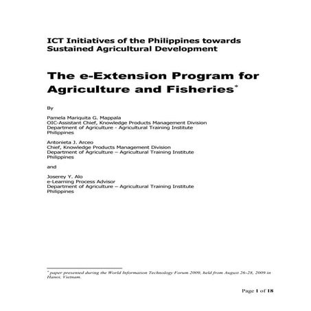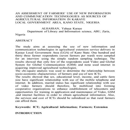 2. 2. CASE STUDY: Presented at the 6th Africa Agriculture Science Week, 15th – 20th July, 2013 - Accra, Ghana With the increased use of ICTs such as mobile phones, it is now possible for farmers in rural and remote areas to be reached by mobile telephone and have access to up-to-date information at any given time. ICTs have therefore proved to be helpful in improving farmers’ access to agricultural extension and marketing services. However, there is need to improve access and application of this information and knowledge so as to increase production, and a result food security and income. FINDINGS Lack of adopted ICT strategy and practice in ministries in charge of agriculture, livestock, fisheries and forestry: i. Lack of capacity of farmers and extension officers in the use of modern ways of communication and information dissemination (ICTs) ii. Lack of access to adequate ICT tools and services by farmers, extension enterprises and extension service officers While National ICT policies have been developed and adopted in various countries, there is no effective provision for ICTs in agriculture. Some countries in Southern Africa are implementing ICT in agriculture projects, yet ministries in charge of agriculture do not have adopted ICT strategies or ICT strategies are not integrated into national agriculture policies. Zambia: With the growing demand for technical information generation and dissemination by farmers, and rapid changes in technology, the ministry of agriculture has in recent years been designing programmes meant to use ICTs in service delivery. Among the notable ones include agricultural information centres, internet based question and answer SMS services, and digitization. Mozambique: The Ministério da Agricultura (MINAG) as of April, 2005 did not have an ICT strategy in place, although the interest to develop was there. The Centro de Documentação Agrária e Informação do Sector Agrária (CDA) at MINAG is the department where web development is being spearheaded. The production of quality content is a concern for CDA management, as the creation of materials suitable for release on the web demands staff capabilities that have yet to be developed. In fact, judging from the date of release of official documents, release onto the website is slow. Between June 2004 and April 2005, the site was not updated. (CTA, 2005) Similar situations were discovered in Zambia, Tanzania, Botswana and Malawi where there are no ICT strategies in the ministry of agriculture, and websites meant to provide agricultural information are simple static sites. They are not frequently updated and therefore lack usefulness. However, due to lack of a clearly defined and adopted ICT strategy in agriculture to provide a framework for integration of ICT in the sector, various challenges have led to most of these projects not achieving the desired results. Other challenges include lack of ICT skills among extension and advisory services departments and lack of appropriate ICTs. For instance, there are situations where senior members of staff do not have competent computer skills and are not able to utilise the use of computers in the agricultural information centres pilot project. With an inclusively designed and adopted ICT strategy, an effective framework of integrating ICT into agriculture can be arrived at.