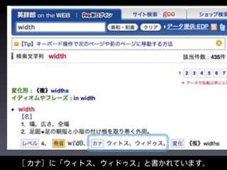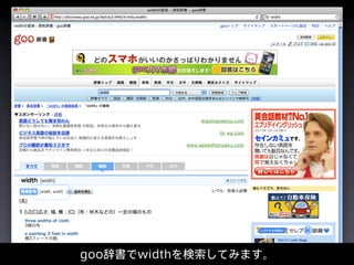 The document discusses CSS properties like width, linear, and relative. It mentions CSS Nite events from 1996-2011 and references getting up at midnight. The author's Twitter handle is provided as @swwwitch and an email takano@swwwitch.com. The document contains technical CSS and HTML terms when discussing width properties and formatting text.