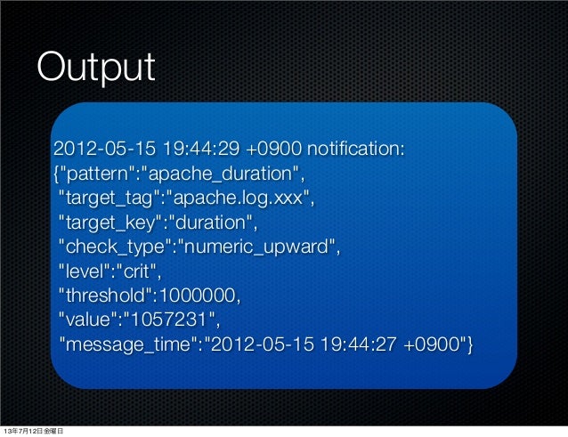 9. 9. Output 2012-05-15 19:44:29 +0900 notification: {"pattern":"apache_duration", "target_tag":"apache.log.xxx", "target_key":"duration", "check_type":"numeric_upward", "level":"crit", "threshold":1000000, "value":"1057231", "message_time":"2012-05-15 19:44:27 +0900"} 13年7月12日金曜日