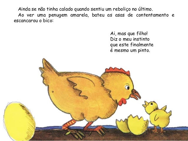 4. 4. - Cocorocó… Que vem a ser isto? – disse ela. – Na minha capoeiratiravam-me os ovos, aqui oferecem-mos. Mas que sorte.E logo se aninhou.Daí por diante, a galinha mal saía do choco.Estava preguiçosa, sentia o corpo quente, quentecomo uma botija.