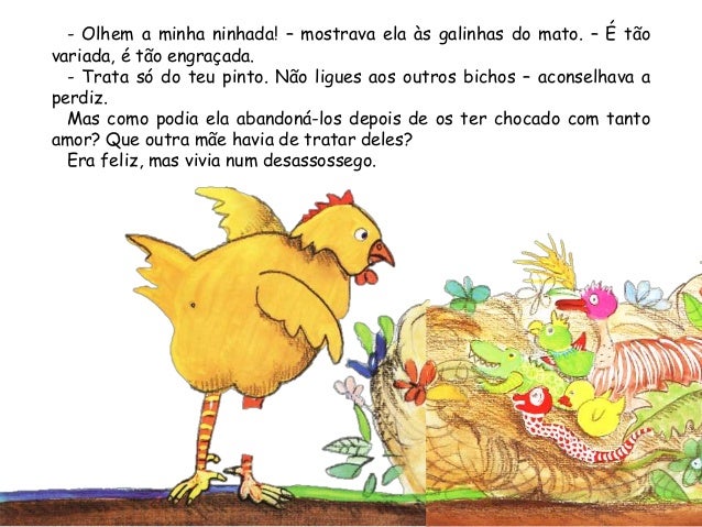 10. 10. - Olhem a minha ninhada! – mostrava ela às galinhas do mato. – É tãovariada, é tão engraçada.- Trata só do teu pinto. Não ligues aos outros bichos – aconselhava aperdiz.Mas como podia ela abandoná-los depois de os ter chocado com tantoamor? Que outra mãe havia de tratar deles?Era feliz, mas vivia num desassossego.