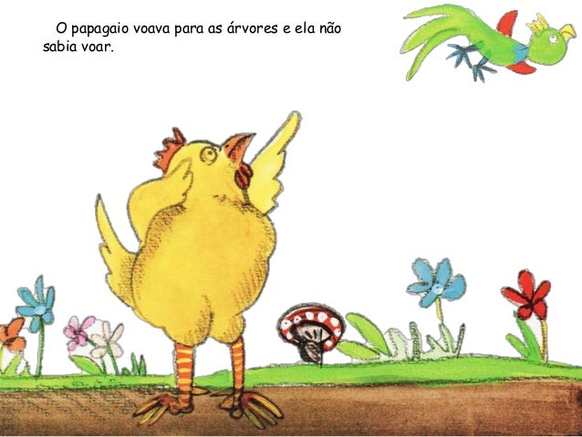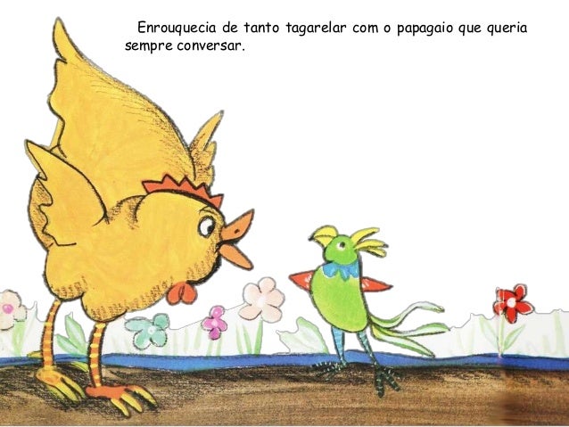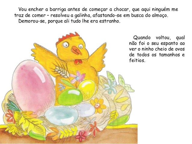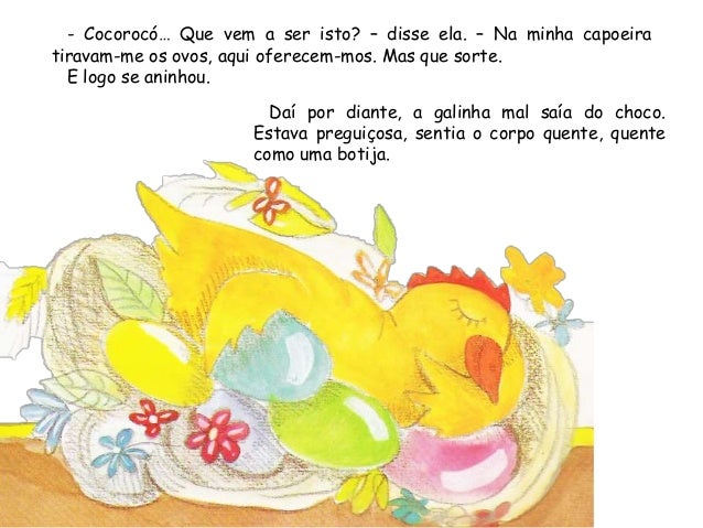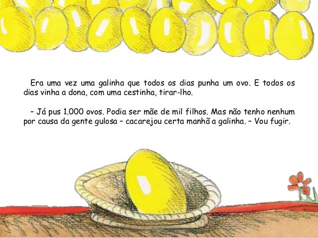1. 1. Era uma vez uma galinha que todos os dias punha um ovo. E todos osdias vinha a dona, com uma cestinha, tirar-lho.– Já pus 1.000 ovos. Podia ser mãe de mil filhos. Mas não tenho nenhumpor causa da gente gulosa – cacarejou certa manhã a galinha. – Vou fugir.