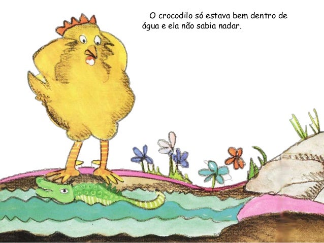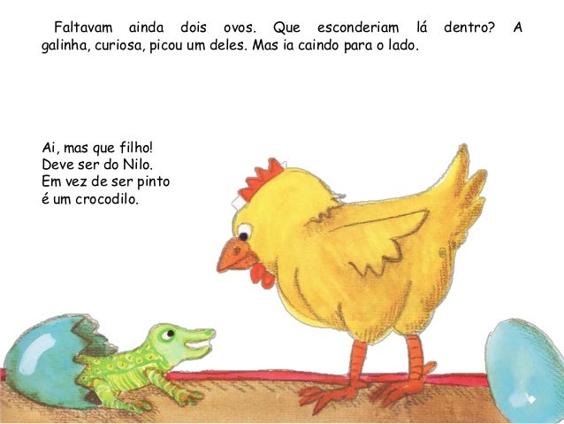 8. 8. Faltavam ainda dois ovos. Que esconderiam lá dentro? Agalinha, curiosa, picou um deles. Mas ia caindo para o lado.Ai, mas que filho!Deve ser do Nilo.Em vez de ser pintoé um crocodilo.