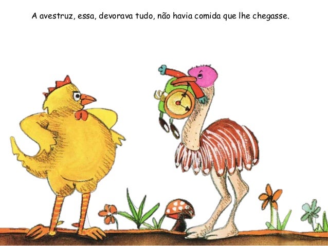 14. 14. A avestruz, essa, devorava tudo, não havia comida que lhe chegasse.