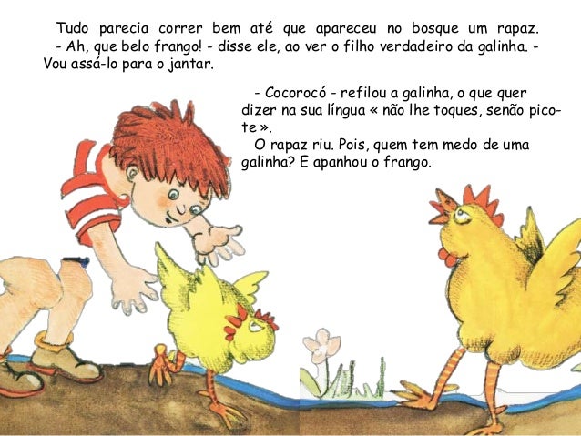 22. 22. Tudo parecia correr bem até que apareceu no bosque um rapaz.- Ah, que belo frango! - disse ele, ao ver o filho verdadeiro da galinha. -Vou assá-lo para o jantar.- Cocorocó - refilou a galinha, o que querdizer na sua língua « não lhe toques, senão pico-te ».O rapaz riu. Pois, quem tem medo de umagalinha? E apanhou o frango.