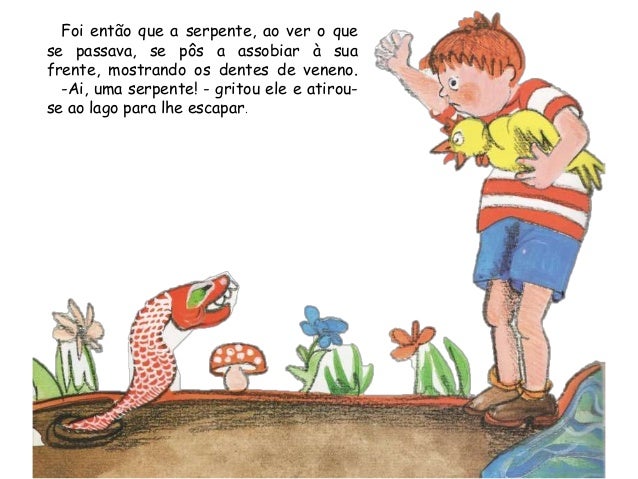 23. 23. Foi então que a serpente, ao ver o quese passava, se pôs a assobiar à suafrente, mostrando os dentes de veneno.-Ai, uma serpente! - gritou ele e atirou-se ao lago para lhe escapar.