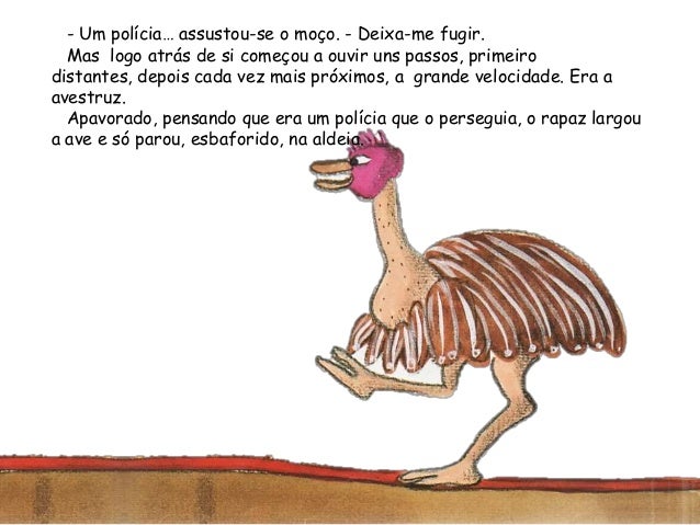 26. 26. - Um polícia… assustou-se o moço. - Deixa-me fugir.Mas logo atrás de si começou a ouvir uns passos, primeirodistantes, depois cada vez mais próximos, a grande velocidade. Era aavestruz.Apavorado, pensando que era um polícia que o perseguia, o rapaz largoua ave e só parou, esbaforido, na aldeia.