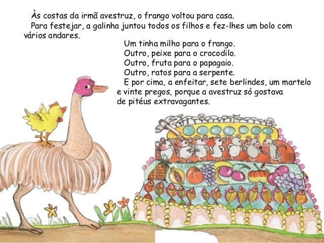 27. 27. Às costas da irmã avestruz, o frango voltou para casa.Para festejar, a galinha juntou todos os filhos e fez-lhes um bolo comvários andares.Um tinha milho para o frango.Outro, peixe para o crocodilo.Outro, fruta para o papagaio.Outro, ratos para a serpente.E por cima, a enfeitar, sete berlindes, um marteloe vinte pregos, porque a avestruz só gostavade pitéus extravagantes.