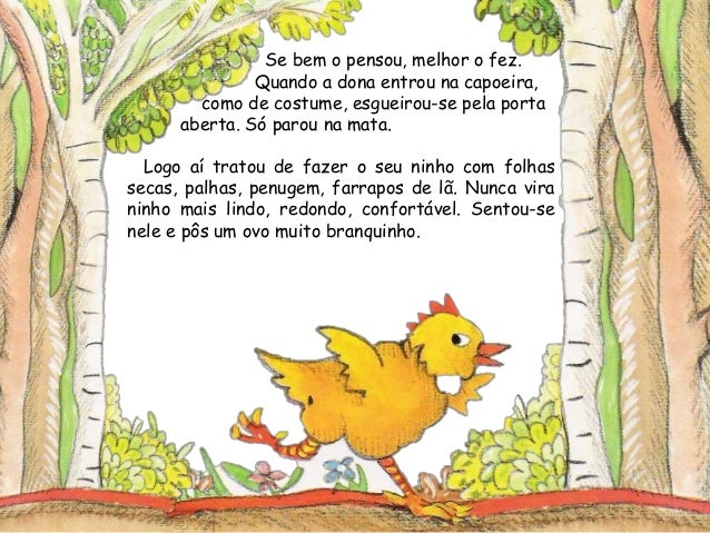 2. 2. Se bem o pensou, melhor o fez.Quando a dona entrou na capoeira,como de costume, esgueirou-se pela portaaberta. Só parou na mata.Logo aí tratou de fazer o seu ninho com folhassecas, palhas, penugem, farrapos de lã. Nunca viraninho mais lindo, redondo, confortável. Sentou-senele e pôs um ovo muito branquinho.
