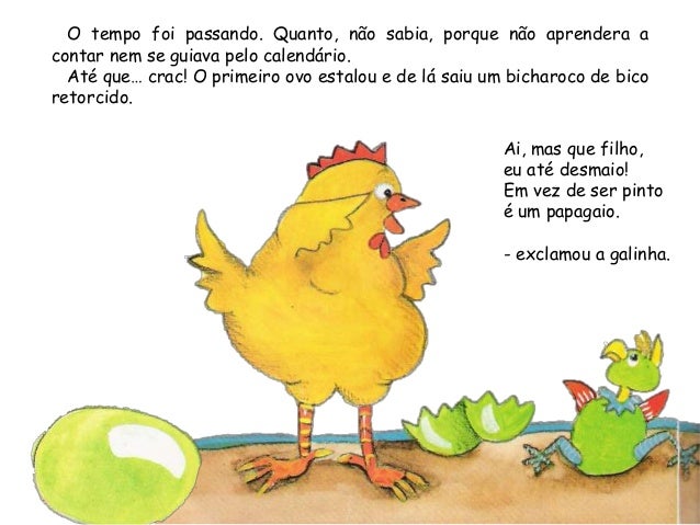 5. 5. O tempo foi passando. Quanto, não sabia, porque não aprendera acontar nem se guiava pelo calendário.Até que… crac! O primeiro ovo estalou e de lá saiu um bicharoco de bicoretorcido.Ai, mas que filho,eu até desmaio!Em vez de ser pintoé um papagaio.- exclamou a galinha.