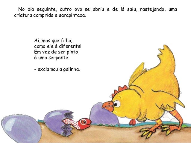 6. 6. No dia seguinte, outro ovo se abriu e de lá saiu, rastejando, umacriatura comprida e sarapintada.Ai, mas que filho,como ele é diferente!Em vez de ser pintoé uma serpente.- exclamou a galinha.
