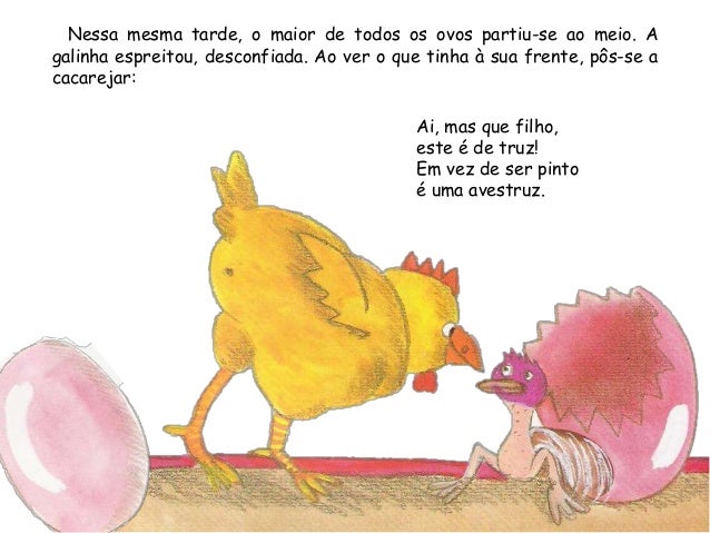 7. 7. Nessa mesma tarde, o maior de todos os ovos partiu-se ao meio. Agalinha espreitou, desconfiada. Ao ver o que tinha à sua frente, pôs-se acacarejar:Ai, mas que filho,este é de truz!Em vez de ser pintoé uma avestruz.