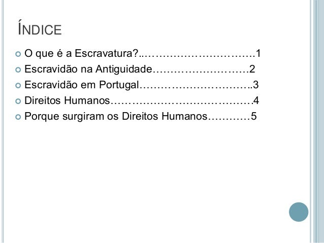 2. 2. ÍNDICE  O que é a Escravatura?..………………………….1  Escravidão na Antiguidade………………………2  Escravidão em Portugal…………………………..3  Direitos Humanos………………………………….4  Porque surgiram os Direitos Humanos…………5