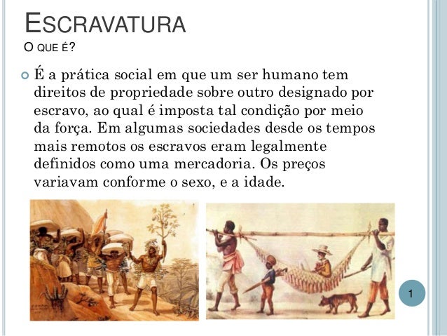3. 3. ESCRAVATURA O QUE É?  É a prática social em que um ser humano tem direitos de propriedade sobre outro designado por escravo, ao qual é imposta tal condição por meio da força. Em algumas sociedades desde os tempos mais remotos os escravos eram legalmente definidos como uma mercadoria. Os preços variavam conforme o sexo, e a idade. 1