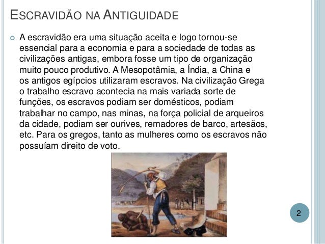 4. 4. ESCRAVIDÃO NA ANTIGUIDADE  A escravidão era uma situação aceita e logo tornou-se essencial para a economia e para a sociedade de todas as civilizações antigas, embora fosse um tipo de organização muito pouco produtivo. A Mesopotâmia, a Índia, a China e os antigos egípcios utilizaram escravos. Na civilização Grega o trabalho escravo acontecia na mais variada sorte de funções, os escravos podiam ser domésticos, podiam trabalhar no campo, nas minas, na força policial de arqueiros da cidade, podiam ser ourives, remadores de barco, artesãos, etc. Para os gregos, tanto as mulheres como os escravos não possuíam direito de voto. 2