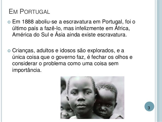 5. 5. EM PORTUGAL  Em 1888 aboliu-se a escravatura em Portugal, foi o último país a fazê-lo, mas infelizmente em África, América do Sul e Ásia ainda existe escravatura.  Crianças, adultos e idosos são explorados, e a única coisa que o governo faz, é fechar os olhos e considerar o problema como uma coisa sem importância. 3