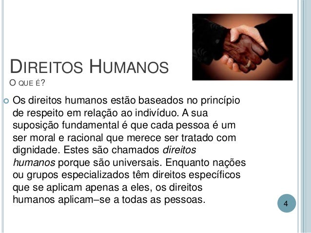 6. 6. DIREITOS HUMANOS O QUE É?  Os direitos humanos estão baseados no princípio de respeito em relação ao indivíduo. A sua suposição fundamental é que cada pessoa é um ser moral e racional que merece ser tratado com dignidade. Estes são chamados direitos humanos porque são universais. Enquanto nações ou grupos especializados têm direitos específicos que se aplicam apenas a eles, os direitos humanos aplicam–se a todas as pessoas. 4