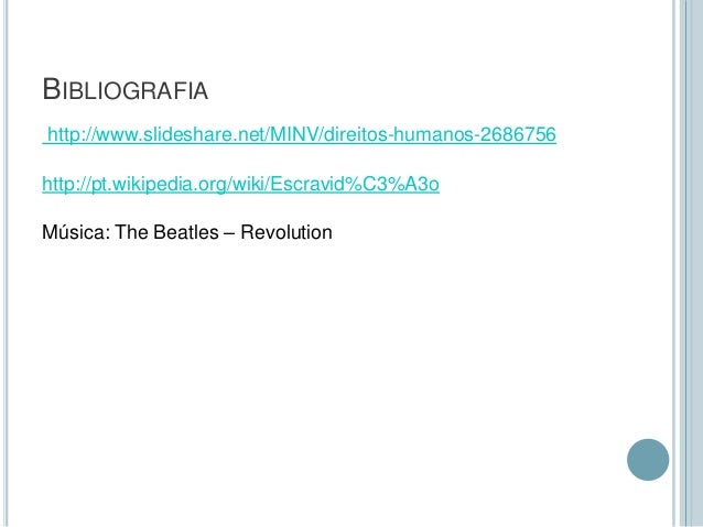 8. 8. BIBLIOGRAFIA http://www.slideshare.net/MINV/direitos-humanos-2686756 http://pt.wikipedia.org/wiki/Escravid%C3%A3o Música: The Beatles – Revolution