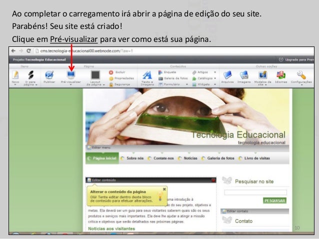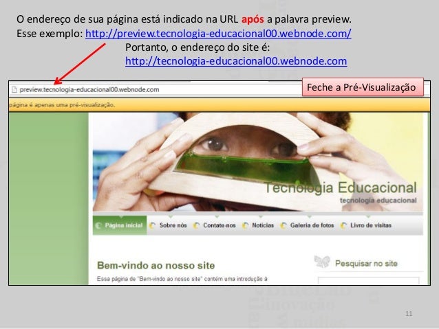 11. 11. O endereço de sua página está indicado na URL após a palavra preview. Esse exemplo: http://preview.tecnologia-educacional00.webnode.com/ Portanto, o endereço do site é: http://tecnologia-educacional00.webnode.com Feche a Pré-Visualização 11