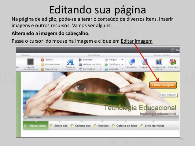 12. 12. Editando sua página Na página de edição, pode-se alterar o conteúdo de diversos itens. Inserir imagens e outros recursos; Vamos ver alguns: Alterando a imagem do cabeçalho. Passe o cursor do mouse na imagem e clique em Editar imagem 12