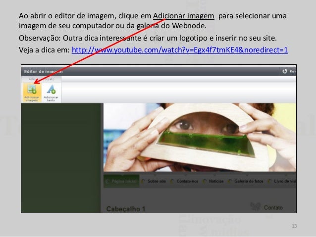 13. 13. Ao abrir o editor de imagem, clique em Adicionar imagem para selecionar uma imagem de seu computador ou da galeria do Webnode. Observação: Outra dica interessante é criar um logotipo e inserir no seu site. Veja a dica em: http://www.youtube.com/watch?v=Egx4f7tmKE4&noredirect=1 13