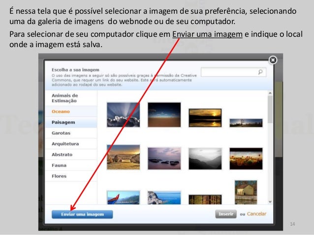 14. 14. É nessa tela que é possível selecionar a imagem de sua preferência, selecionando uma da galeria de imagens do webnode ou de seu computador. Para selecionar de seu computador clique em Enviar uma imagem e indique o local onde a imagem está salva. 14
