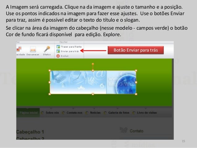 15. 15. A Imagem será carregada. Clique na da imagem e ajuste o tamanho e a posição. Use os pontos indicados na imagem para fazer esse ajustes. Use o botões Enviar para traz, assim é possível editar o texto do título e o slogan. Se clicar na área da imagem do cabeçalho (nesse modelo - campos verde) o botão Cor de fundo ficará disponível para edição. Explore. Botão Enviar para trás 15
