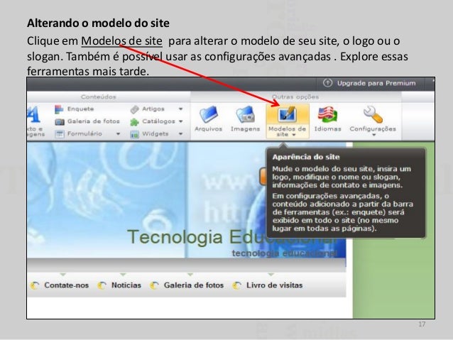 17. 17. Alterando o modelo do site Clique em Modelos de site para alterar o modelo de seu site, o logo ou o slogan. Também é possível usar as configurações avançadas . Explore essas ferramentas mais tarde. 17