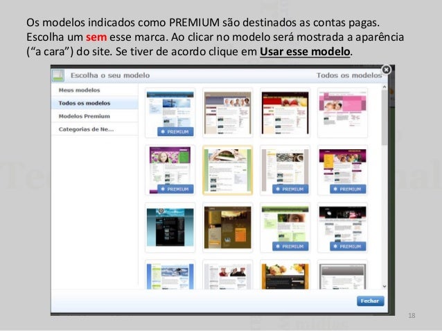18. 18. Os modelos indicados como PREMIUM são destinados as contas pagas. Escolha um sem esse marca. Ao clicar no modelo será mostrada a aparência (“a cara”) do site. Se tiver de acordo clique em Usar esse modelo. 18