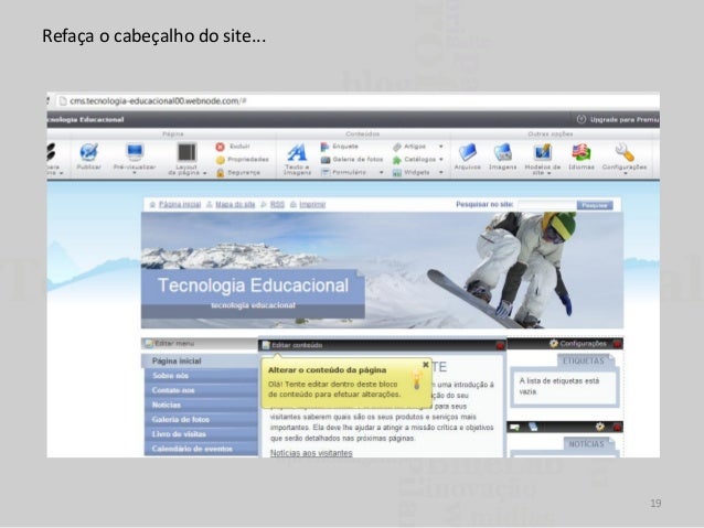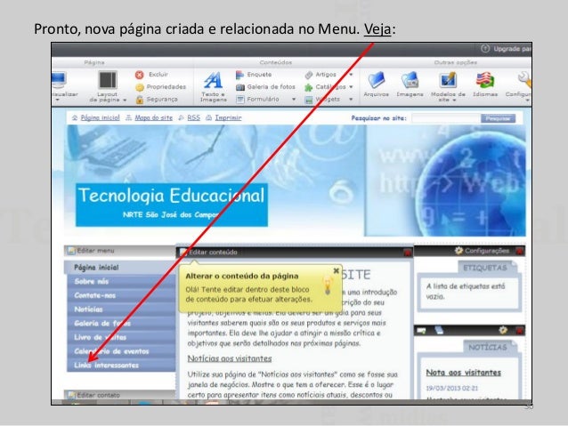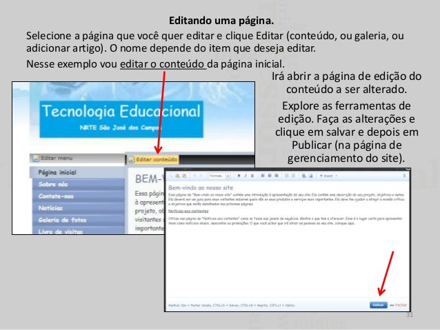 31. 31. Editando uma página. Selecione a página que você quer editar e clique Editar (conteúdo, ou galeria, ou adicionar artigo). O nome depende do item que deseja editar. Nesse exemplo vou editar o conteúdo da página inicial. Irá abrir a página de edição do conteúdo a ser alterado. Explore as ferramentas de edição. Faça as alterações e clique em salvar e depois em Publicar (na página de gerenciamento do site). 31