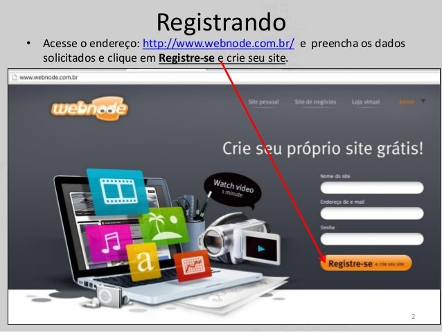 2. 2. Registrando • Acesse o endereço: http://www.webnode.com.br/ e preencha os dados solicitados e clique em Registre-se e crie seu site. 2