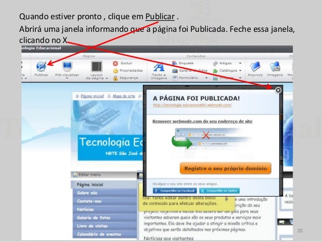 20. 20. Quando estiver pronto , clique em Publicar . Abrirá uma janela informando que a página foi Publicada. Feche essa janela, clicando no X. 20