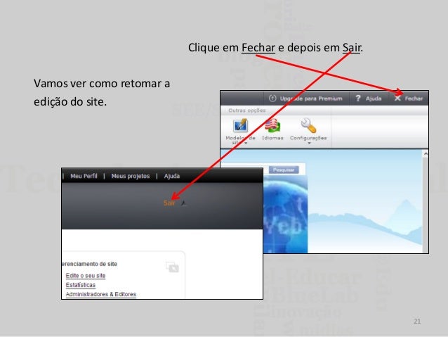 21. 21. Clique em Fechar e depois em Sair. Vamos ver como retomar a edição do site. 21
