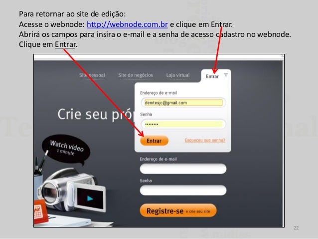 22. 22. Para retornar ao site de edição: Acesse o webnode: http://webnode.com.br e clique em Entrar. Abrirá os campos para insira o e-mail e a senha de acesso cadastro no webnode. Clique em Entrar. 22