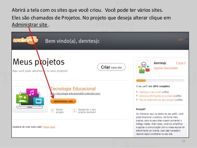 23. 23. Abrirá a tela com os sites que você criou. Você pode ter vários sites. Eles são chamados de Projetos. No projeto que deseja alterar clique em Administrar site . 23