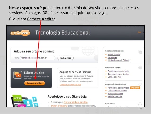 24. 24. Nesse espaço, você pode alterar o domínio do seu site. Lembre-se que esses serviços são pagos. Não é necessário adquirir um serviço. Clique em Comece a editar. 24