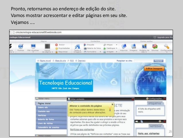 25. 25. Pronto, retornamos ao endereço de edição do site. Vamos mostrar acrescentar e editar páginas em seu site. Vejamos .... 25