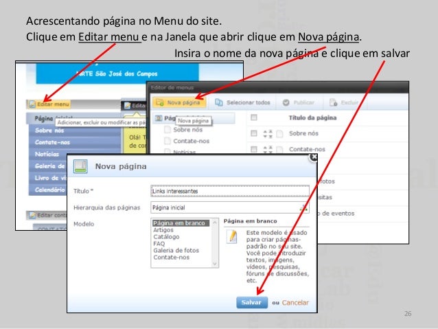 26. 26. Acrescentando página no Menu do site. Clique em Editar menu e na Janela que abrir clique em Nova página. Insira o nome da nova página e clique em salvar 26