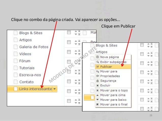 28. 28. Clique no combo da página criada. Vai aparecer as opções... Clique em Publicar 28
