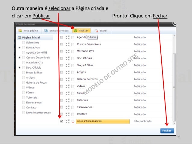 29. 29. Outra maneira é selecionar a Página criada e clicar em Publicar Pronto! Clique em Fechar 29