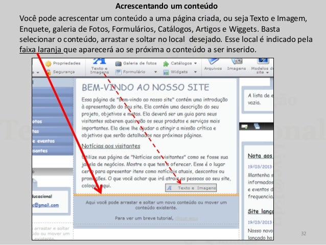 32. 32. Acrescentando um conteúdo Você pode acrescentar um conteúdo a uma página criada, ou seja Texto e Imagem, Enquete, galeria de Fotos, Formulários, Catálogos, Artigos e Wiggets. Basta selecionar o conteúdo, arrastar e soltar no local desejado. Esse local é indicado pela faixa laranja que aparecerá ao se próxima o conteúdo a ser inserido. 32