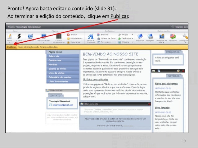 33. 33. Pronto! Agora basta editar o conteúdo (slide 31). Ao terminar a edição do conteúdo, clique em Publicar. 33