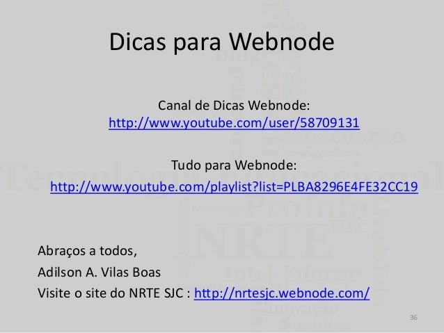 36. 36. Dicas para Webnode Canal de Dicas Webnode: http://www.youtube.com/user/58709131 Tudo para Webnode: http://www.youtube.com/playlist?list=PLBA8296E4FE32CC19 Abraços a todos, Adilson A. Vilas Boas Visite o site do NRTE SJC : http://nrtesjc.webnode.com/ 36
