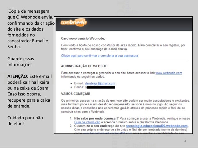 4. 4. Cópia da mensagem que O Webnode envia, confirmando da criação do site e os dados fornecidos no cadastrado: E-mail e Senha. Guarde essas informações. ATENÇÃO: Este e-mail poderá cair na lixeira ou na caixa de Spam. Caso isso ocorra, recupere para a caixa de entrada. Cuidado para não deletar ! 4