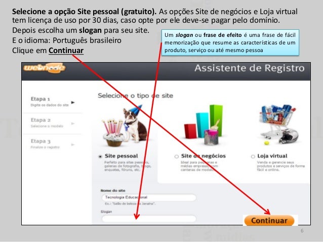 6. 6. Selecione a opção Site pessoal (gratuito). As opções Site de negócios e Loja virtual tem licença de uso por 30 dias, caso opte por ele deve-se pagar pelo domínio. Depois escolha um slogan para seu site. Um slogan ou frase de efeito é uma frase de fácil E o idioma: Português brasileiro memorização que resume as características de um produto, serviço ou até mesmo pessoa Clique em Continuar 6