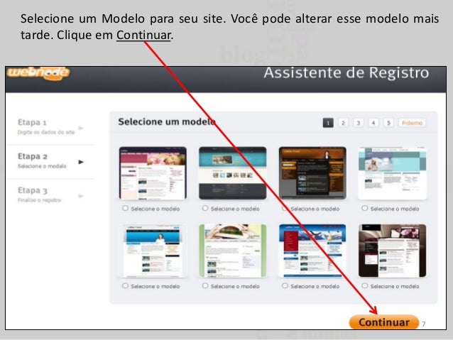 7. 7. Selecione um Modelo para seu site. Você pode alterar esse modelo mais tarde. Clique em Continuar. 7